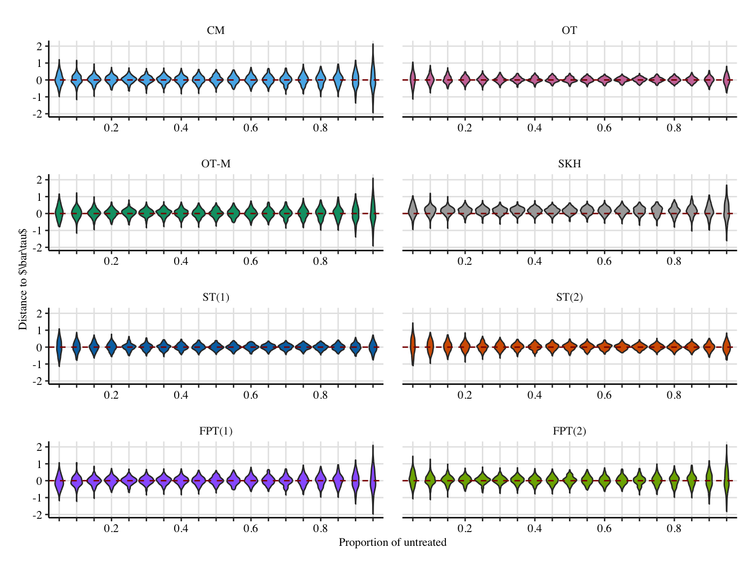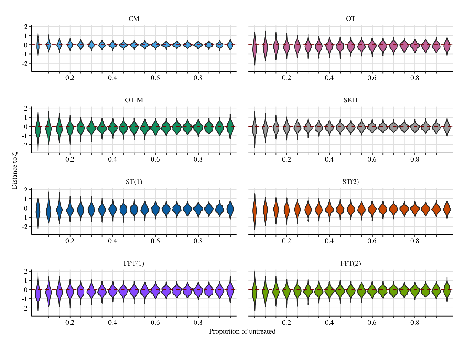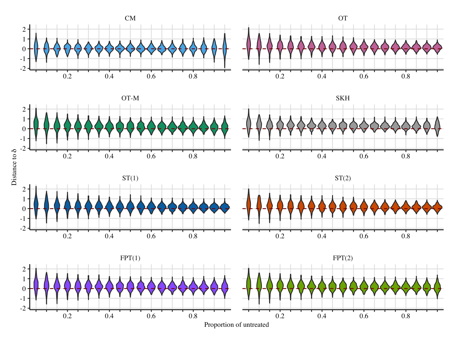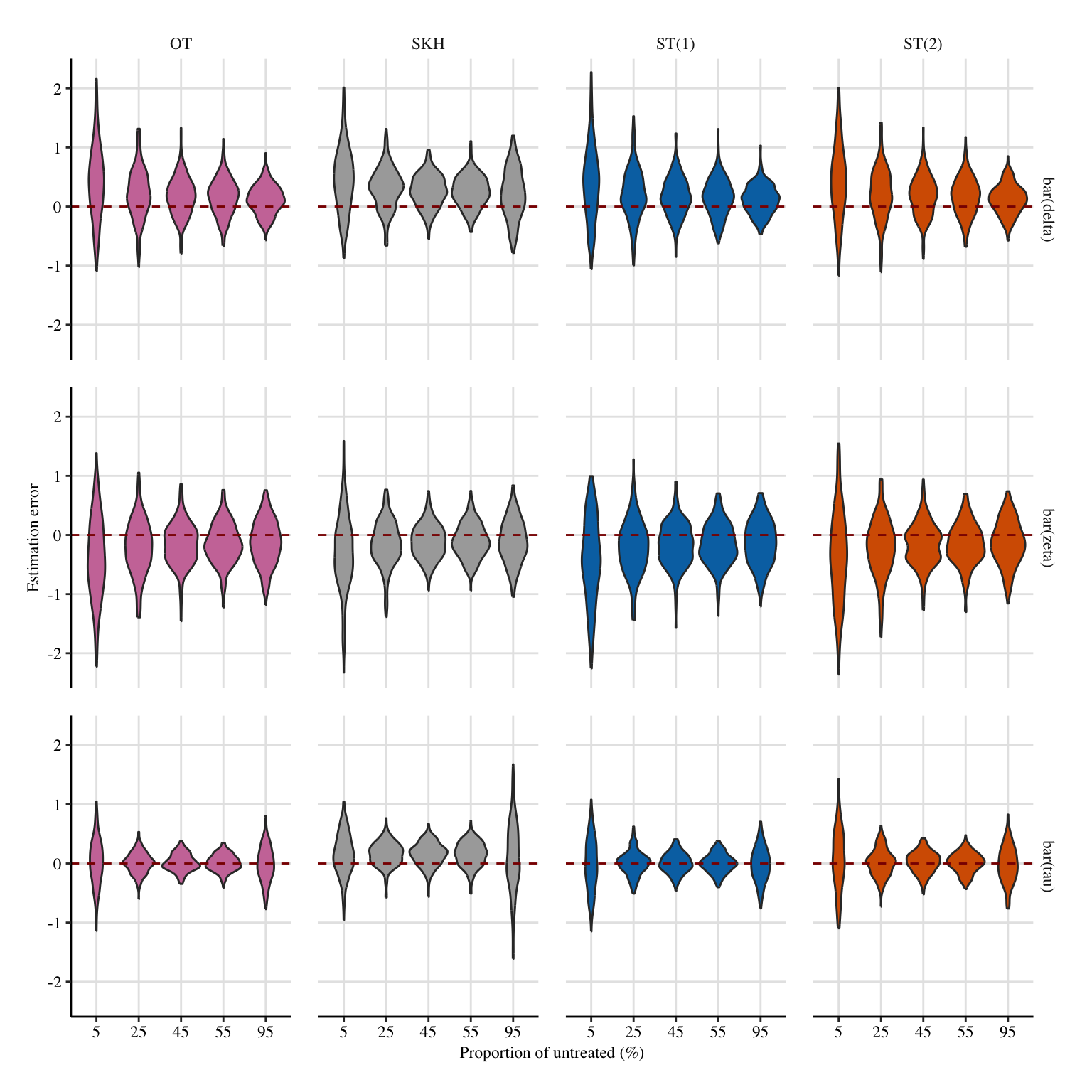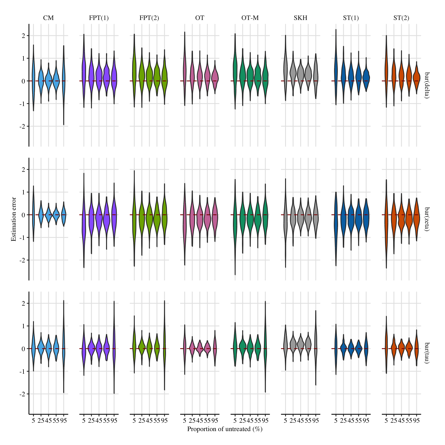 In this section, we let the proportion of untreated/treated units vary from 5% of 0s to 95% of them. Note that we go back to the distance between the mean equal to 1, as in Chapter 5.