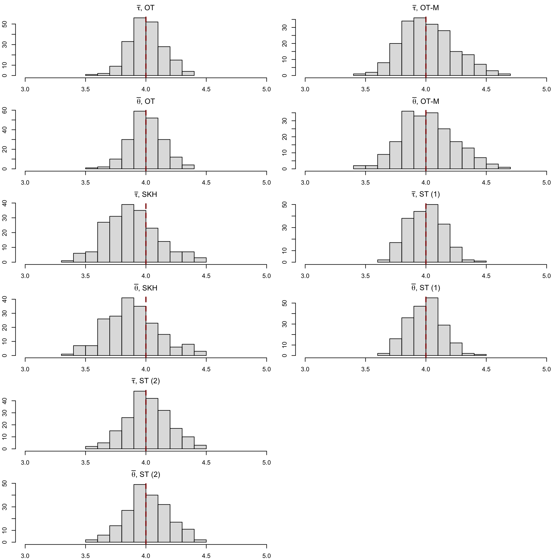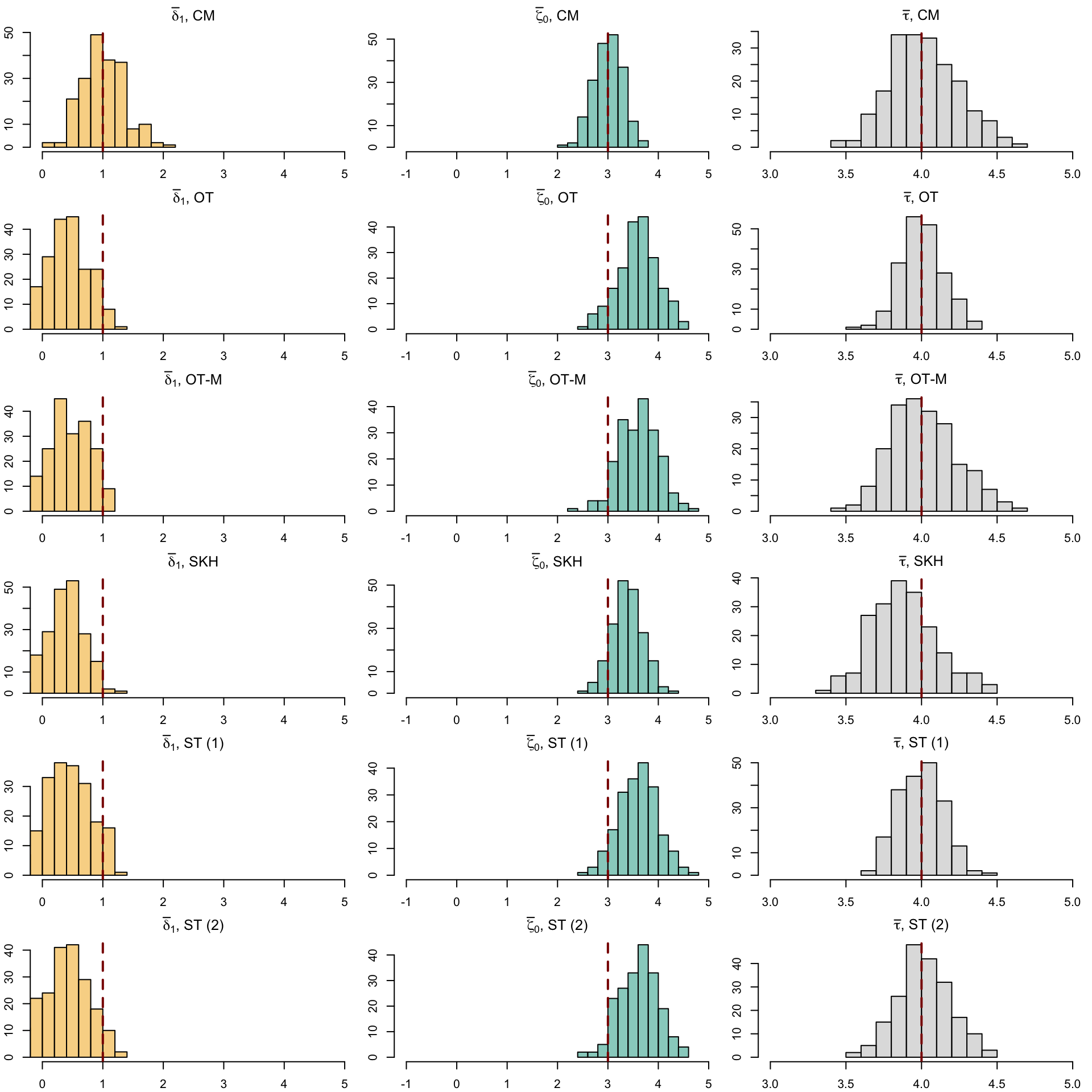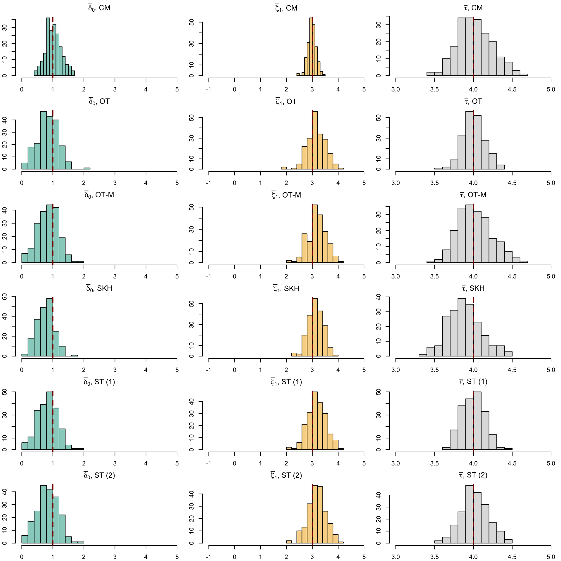 x_lim <- c(-1,5); plot_hist_sim(metric_name = "zeta_0_ot", method_label = "OT", x_lim = x_lim, export_tikz = export_tikz)