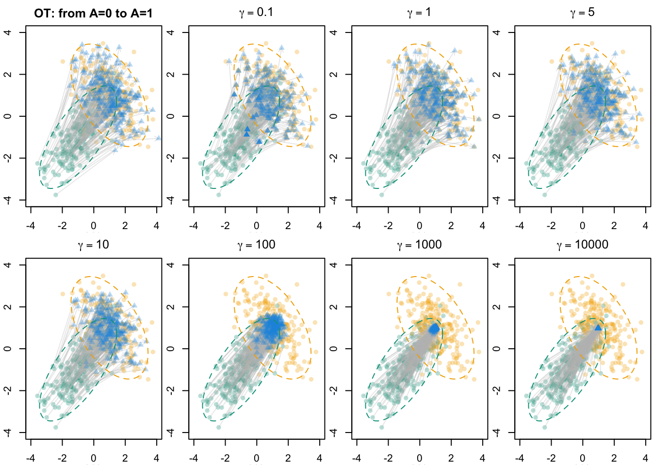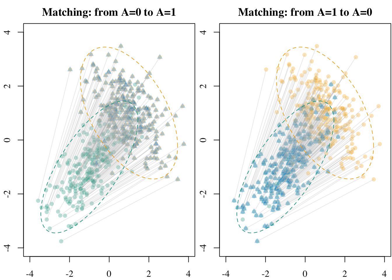 library(expm)Given two collection of points \(\{\boldsymbol{x}_{0,1},\cdots,\boldsymbol{x}_{0,n_0}\}\) and \(\{\boldsymbol{x}_{1,1},\cdots,\boldsymbol{x}_{1,n_1}\}\) in \(\mathcal{X}_0\) and \(\mathcal{X}_1\), and a cost \(c:\mathcal{X}_0\times\mathcal{X}_1\to\mathbb{R}_+\), define the cost matrix, \(n_0\times n_1\), \(\boldsymbol{C}:=[C_{i,j}]\) where \(C_{i,j}=c(\boldsymbol{x}_{0,i},\boldsymbol{x}_{1,j})\). The optimal matching problem is [ {({n_0},{n_1})} ,,,,, ={i=1}^{n_0}{j=1}^{n_1}P{ij},C_{ij}, ] where \(\mathcal{U}(\boldsymbol{1}_{n_0},\boldsymbol{1}_{n_1})\) is the polytope [ {,P+^{n_0n_1}: P,{n_1}=, P^_{n_0}= }. ]