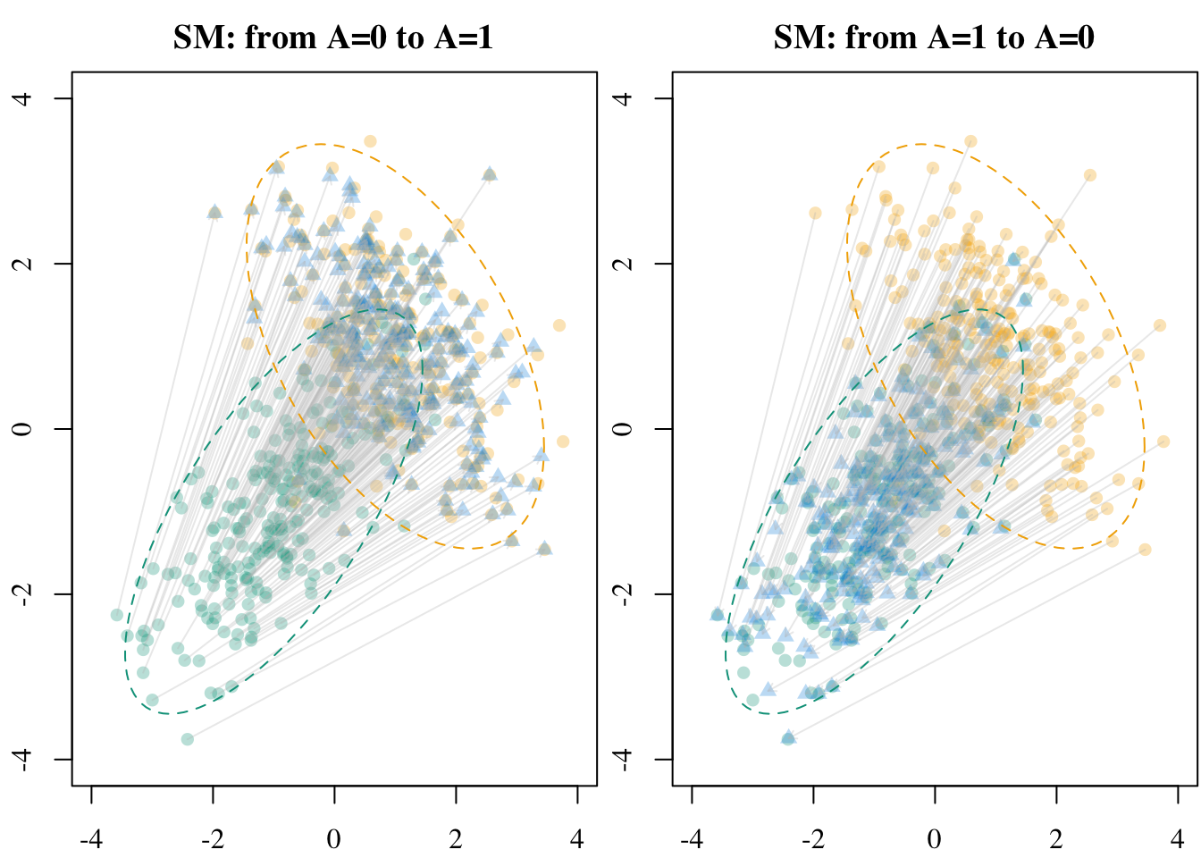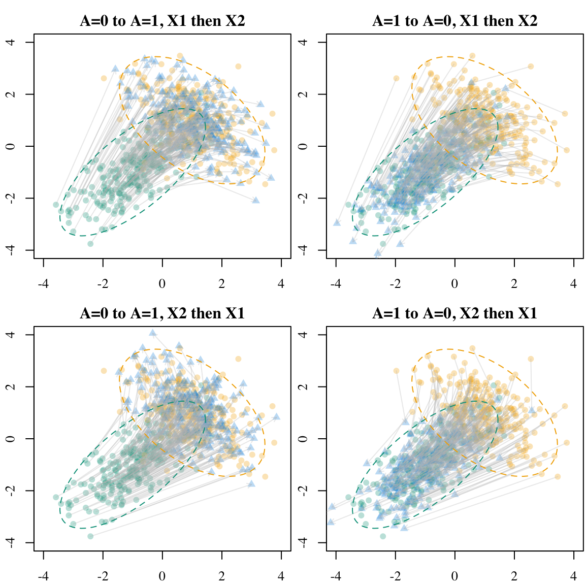 In this chapter, we generate a binary treatment \(a\in\{0,1\}\) (assigned in a well-balances manner) which affects two mediators, \(x_1\) and \(x_2\), as well as an outcome \(y\). The outcome is generated according to a linear model. We then compute causal effects using different methods (causal mediation analysis, as well as transport-based methods).