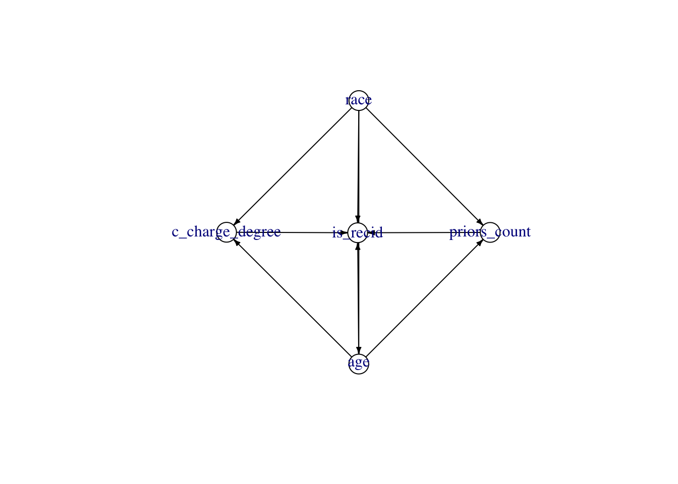 #write.csv(tb, "compas.csv", row.names = FALSE)We assume the DAG shown in Figure 14.1.